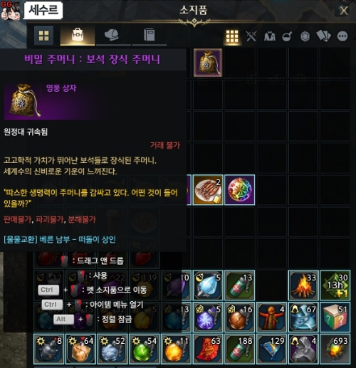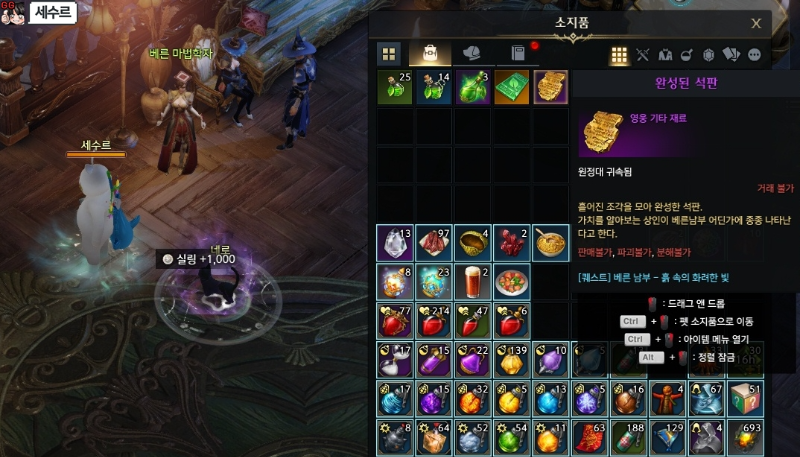 3. '완성된 석판'을 베른 남부 떠돌이 상인이 판매하는 '비밀 주머니 : 보석 장식 주머니'로 교환하여 사용해주면 세계수의 잎#85 획득