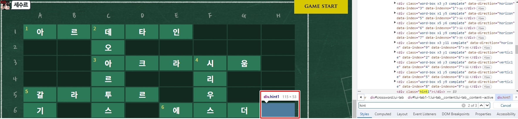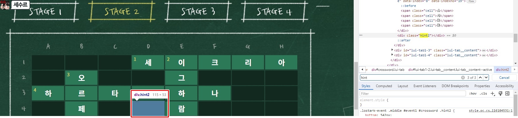 스테이지1에 있는 빈칸에 5번 클릭, 스테이지2에 있는 빈칸 5번 클릭하면 힌트가 각각 나옵니다.