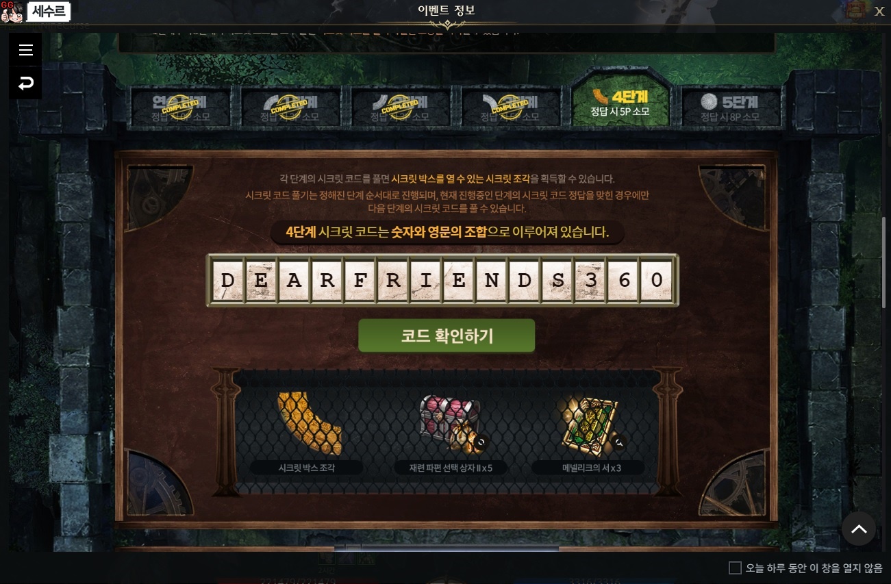 시크릿 코드 4단계 정답 DEARFRIENDS360 - Dear. Friends 로스트아크 콘서트 페이지(https://lostark.game.onstove.com/Promotion/Invite/220518)에 들어가 보면
