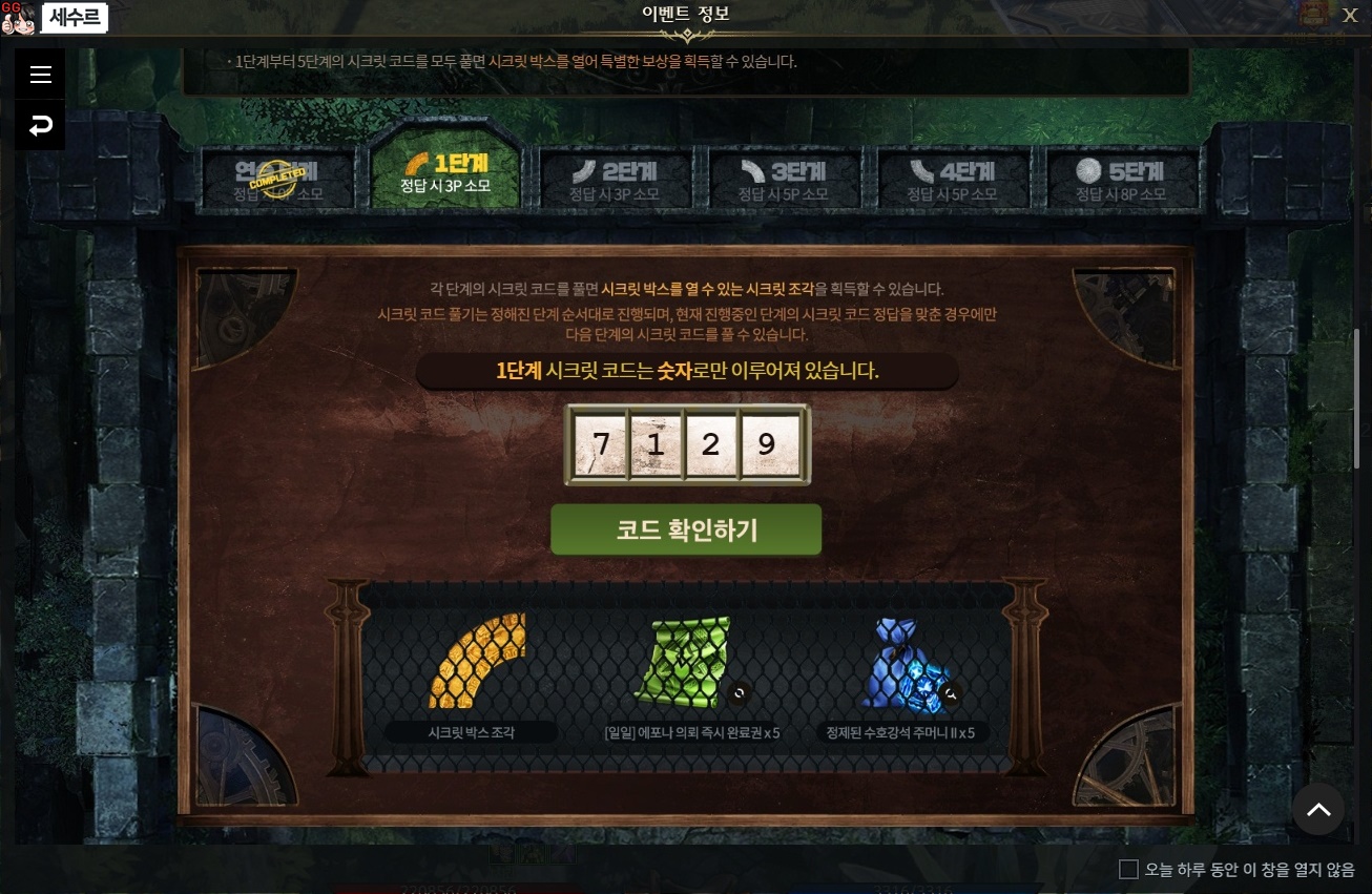 시크릿 코드 1단계 정답 7129 - 7개의 서버 12개의 직업 9개의 대륙입니다.