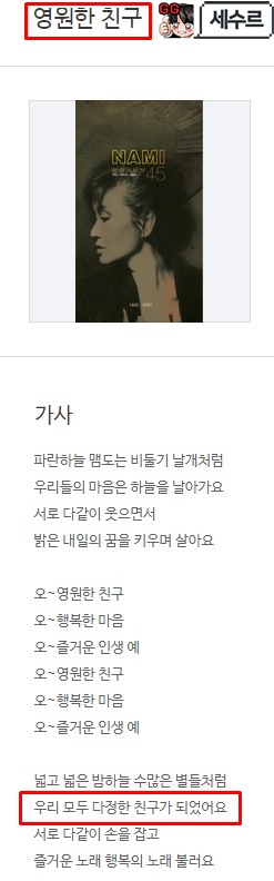 우리 모두 다정한 친구가 되었어요. 를 검색해보면 나미의 영원한 친구 노래가 나오게 됩니다.
