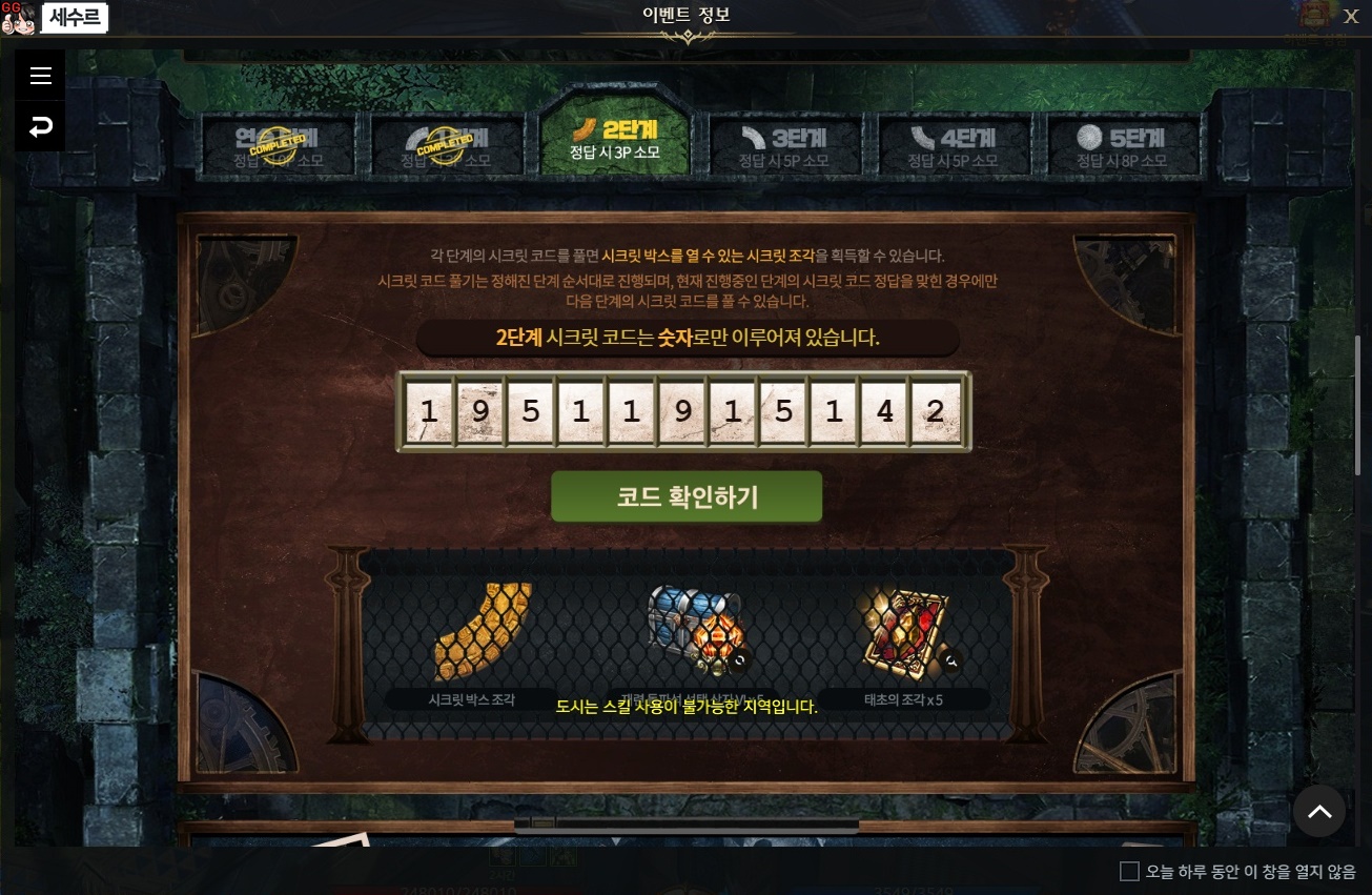 시크릿 코드 2단계 정답 19511915142 - 8월 12일 로아 시즌2의 season2를 알파벳 순서 대로 배열 A=1, B=2, C=3, D=4 ...