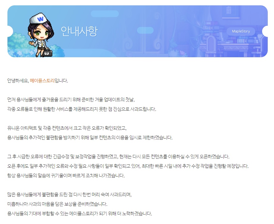 2023년 12월 21일 메이플스토리에서 겨울 이벤트로 시작한 유니온 아티팩트 콘텐츠에서 오류가 발생해 유저들에게 보상을 해준다고 합니다.