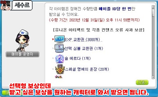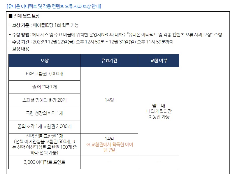 유니온 아티팩트 및 각종 컨텐츠 오류 사과 보상을 누르시면