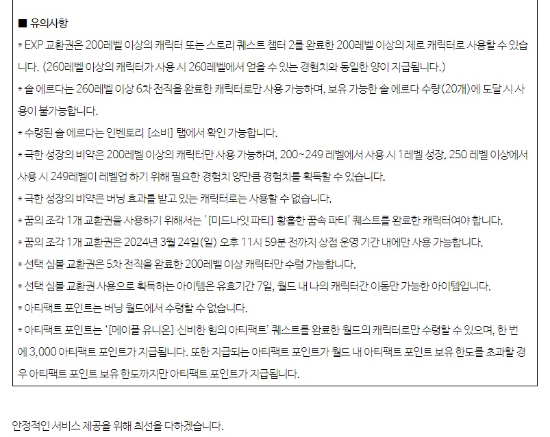 - 선택 심볼 교환권은 5차 전직을 완료한 200 레벨 이상 캐릭터만 수령 가능 (유효기간 동안 월드 내 캐릭터 이동 가능)