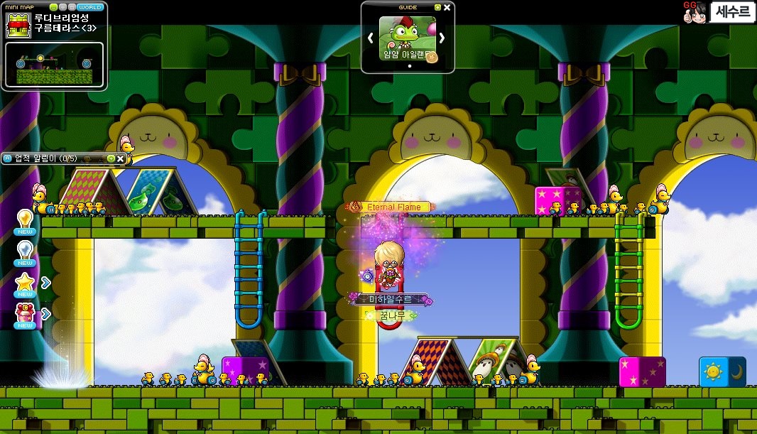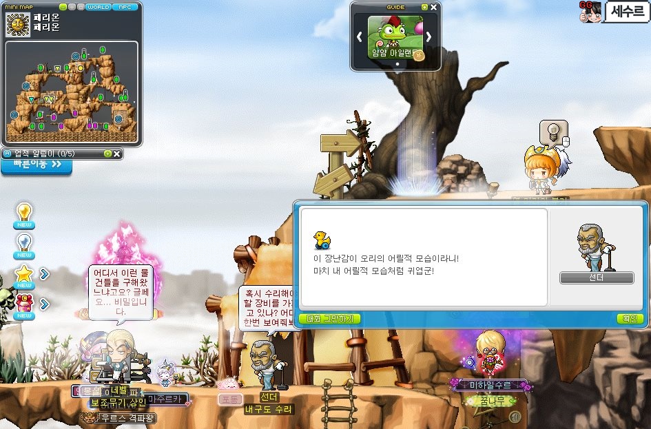루디브리엄에 구름테라스에 가서 더키 패밀리 잡아 '장난감 새끼오리' 10개를 모아서 다시 페리온 NPC 선더에게 갑니다.